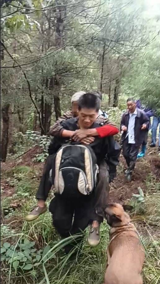 开辟出仅容一人通过的通道后,赵宗波与同行家属缓缓下行,终于在刺丛深处找到了蜷缩的张某。确认老人意识清醒、精神状态良好后,赵宗波小心将老人背起,一手环住老人双腿稳固身体,一手紧抓救援绳缓慢向上攀爬;家属在后方托举老人背部辅助发力,“追风”则沿着通道外侧随行。经过20余分钟协作,3人成功抵达山顶安全区域。